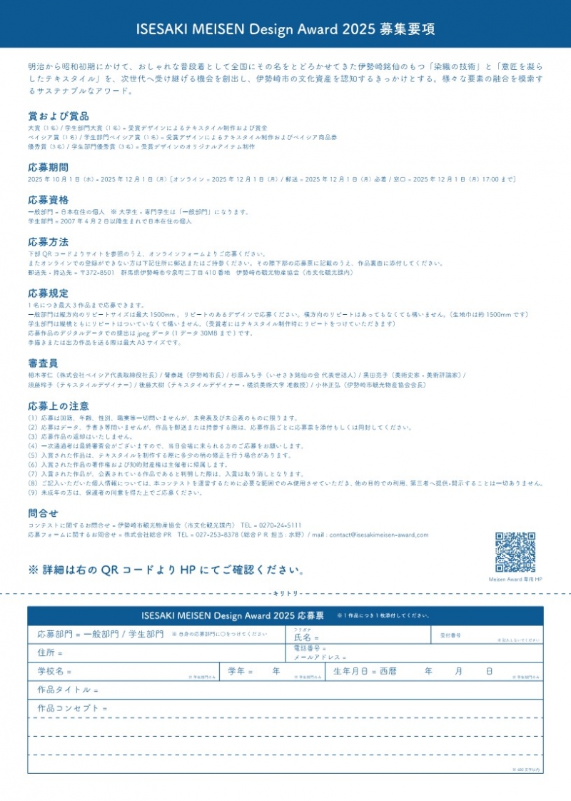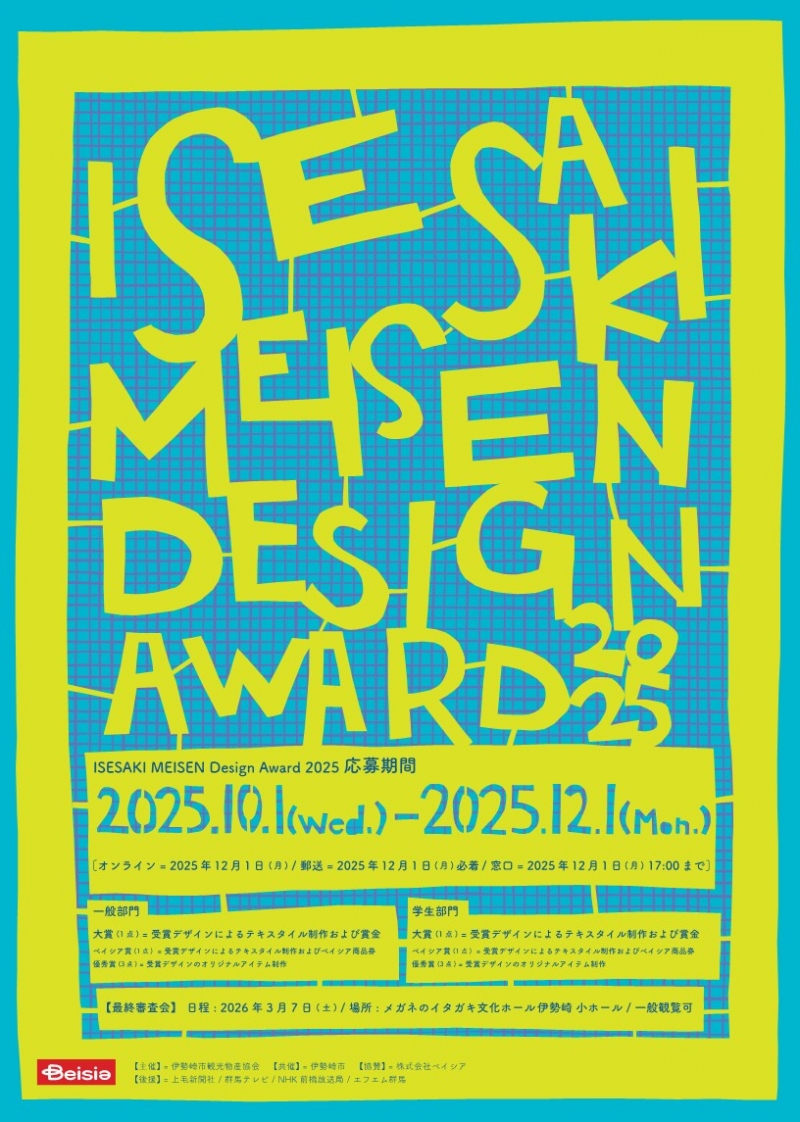 そのような中、「ISESAKI MEISEN Design Award」が行われます。伊勢崎市観光物産協会が主催するもので、未来へ受け継ぐ「伊勢崎銘仙」のテキスタイルデザインの募集です。