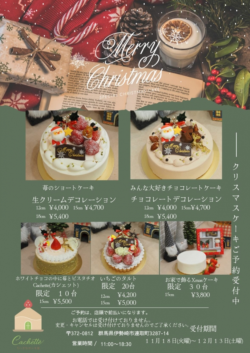 クリスマス用のデコレーションケーキの予約もスタート(店頭受付)。飾りが別添えになった「おうちで飾るXmasケーキ」もあり、家族でオリジナルケーキを仕上げる楽しさが広がります。ファミリーでの来店が多いカシェットならではの、あたたかい企画です。