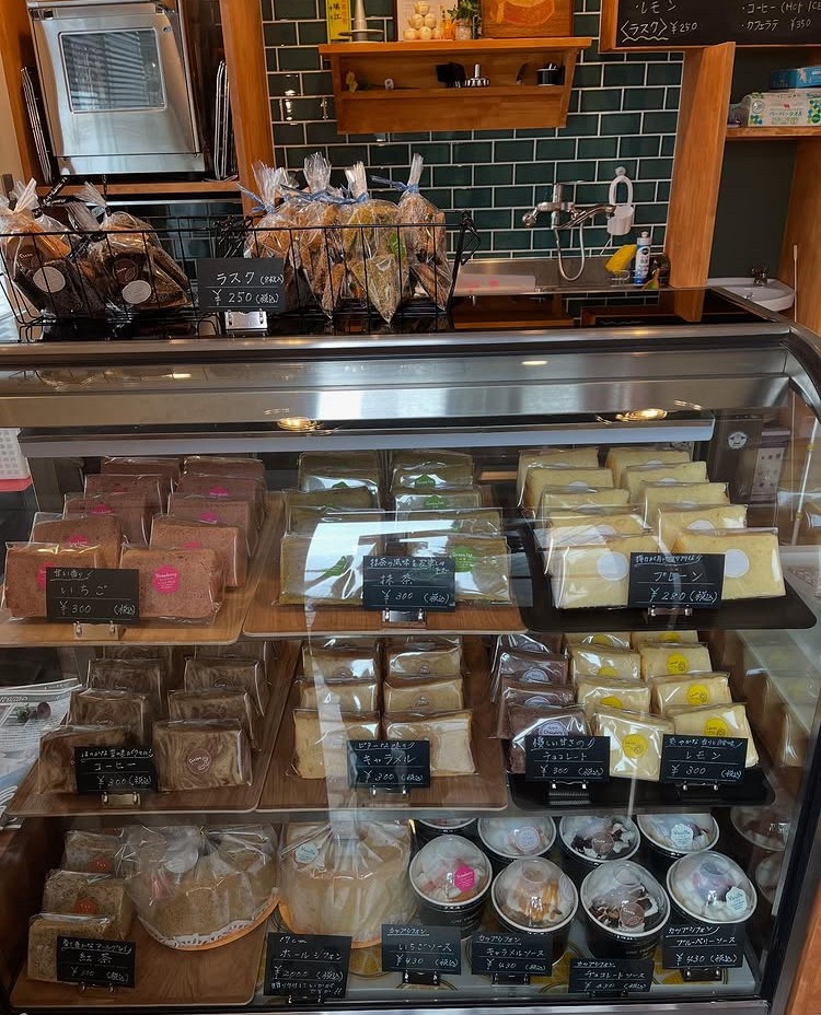 営業日は木曜と土曜の週2回。毎回8種類ほどのシフォンケーキが並びます。プレーン、バニラ、ブラックココア、アールグレイなどの定番から、季節限定のフレーバーまで、訪れるたびに違った楽しみがあります。
