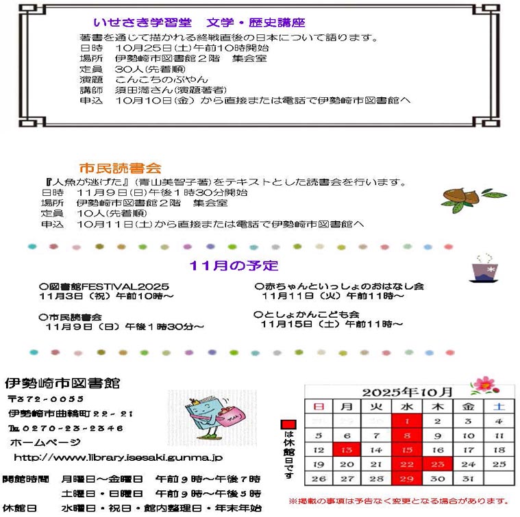 「伊勢崎市図書館 10月の伊勢崎市図書館だより 」を見てます!