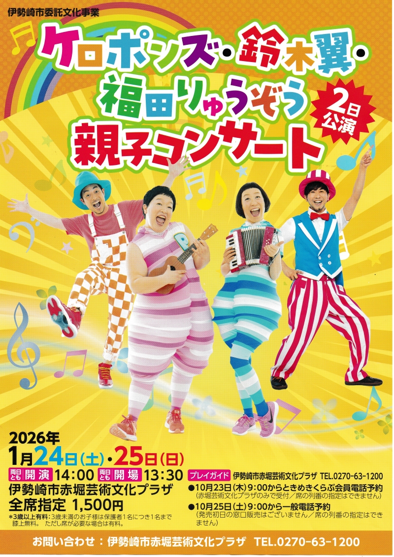 「伊勢崎市赤堀芸術文化プラザ ケロポンズ・鈴木翼・福田りゅうぞう親子コンサート 」を見てます!